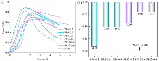 Researchers were more concerned with the ductility enhancement of FRCTWRF by fibers than the strength change. To scrutinize the impact of fiber long/content on ductility of FRCTWRF, slope K of post-peak curve was used as a parameter for the strength evaluation of FRCTWRF. Figure 4b shows the impact of fiber long/dose on slope K. One can interpret that; the K value of N-PP is the smallest at −0.20. Increasing the fiber length can lead to enhanced post-peak ductility of FRCTWRF at a certain fiber content. Let us say that the K value for 6-0.3 is −0.18 and for 12-0.3 is −0.09, which is a 50% increase in K value. FRCTWRF with 0.3 wt.% fiber content has the minimum K value and the worst ductility for a confident fiber length. The K values increased by 44.4% (6 mm) and 55.6% (12 mm) for fiber content increasing from 0.3 wt.% to 0.6 wt.%, respectively. As the content of fiber continued to increase, the K value remained constant.