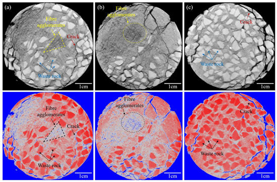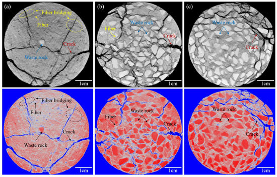 One can interpret from Figure 5 that 6 mm fiber lengths were distributed more uniformly in the FRCTWRF, and no fiber agglomeration was found. Some fibers penetrate both sides of the fissure and show an obvious bridging effect. The waste rock was not uniformly distributed in FRCTWRF, waste rock was less in the upper part of FRCTWRF (only one waste rock is found in Figure 5a), and waste rock was mostly focused on the middle/lower parts of FRCTWRF. Distribution of fissures and waste rocks was opposite, mainly distributed in the upper part of FRCTWRF. This may be related to the waste rock settlement [58].