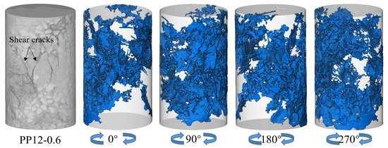 Figure 9 and Figure 10 show 3D reconstructed images of cracks in PP6-0.6 and PP12-0.6, respectively. More tensile cracks are presented in PP6-0.6, which reveals tensile damage. The cracks are reduced in the bottom region, showing incomplete continuous sheet cracks. The crack structure is more complicated in PP12-0.6. The cracks showed discontinuous sheet shear cracks, and PP12-0.6 was shear damage. The crack volume was 4749.11 mm3 in PP6-0.6 and 3764.69 mm3 in PP12-0.6. One could say that increasing the fiber length resulted in a 20.73% drop in the crack volume. This shows that increasing fiber length can improve FRCTWRF’s cracking resistance.