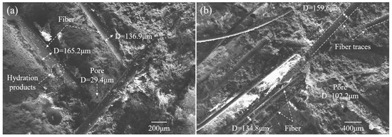 Figure 11 showed the microstructure images of PP6-0.6 and PP12-0.9. Three microstructures, namely FRCTWRF matrix, fibers, and pores, could be seen in SEM images. The FRCTWRF matrix was much denser. The pore diameters were 29.4 μm and 102.2 μm within PP6-0.6 and PP12-0.9, respectively. The fibers were connected to FRCTWRF by hydration products. A large quantity of hydration materials was involved in the external part of visible fibers. The main consequences displayed that some of hydration products were separated from the FRCTWRF matrix and attached to the surface of PF fibers after FRCTWRF cracking. This clearly indicates that the influence of bonding is well-observed between fibers and FRCTWRF matrix from SEM micrographs, and 12 mm fiber length was also deformed after being pulled out. In contrast, the 6-mm-long fibers were not significantly deformed.