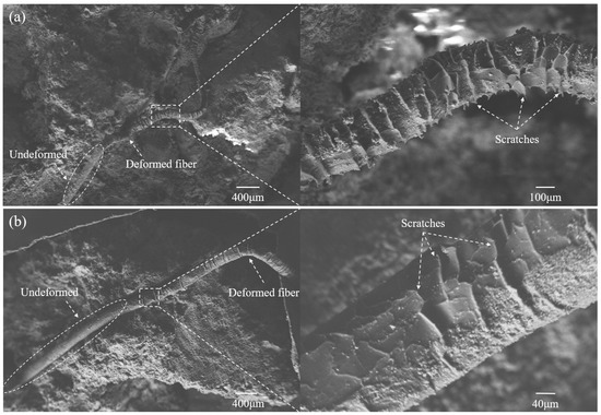 Figure 12 presents the morphological images of two extracted fibers in PP12-0.3. It could be observed that the pulled end of fiber was bent and deformed, while the other part was not deformed. A large number of neatly arranged scale-like FRCTWRF matrix were found on the surface of the extracted fibers. This was caused by the sliding of the fibers in the FRCTWRF matrix. This FRCTWRF matrix was not found on the surface of 6 mm long fibers. This may be due to the short sliding distance of 6 mm-long fibers in the FRCTWRF matrix.