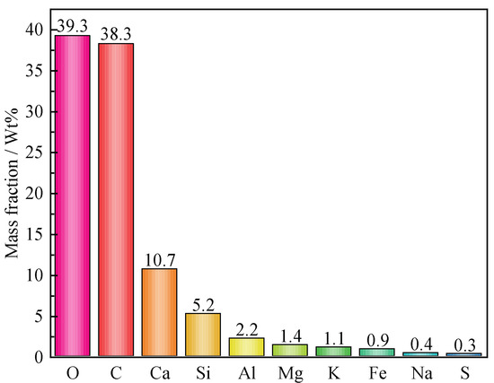 Figure 13 showed the microscopic morphology and elemental distribution of hydration materials within FRCTWRF. One could deduce that the main hydration materials were CSH gels, and a slight quantity of needle-like Ca alumina (AFt). From elemental distribution results, it can be seen that O, C, Ca, Si, and Al are the chief features of cement hydration products. Figure 14 showed the mass percentages of each element in hydration products. One can also say that O and C have the highest content with 39.3 wt.% and 38.3 wt.%, respectively.