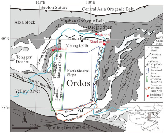 - Shang, J.W. Structural Evolution of Ordos Basin. Ind. Sci. Trib. 2020, 19, 46–47. (In Chinese) [Google Scholar]