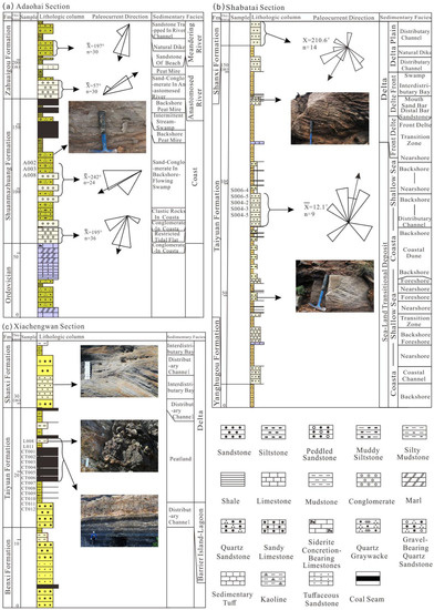 Stratigraphic column of the Taiyuan Formation in Adaohai section (a), Shabatai section (b) and Xiachengwan section (c) (the direction of paleocurrent according to [14,15]).