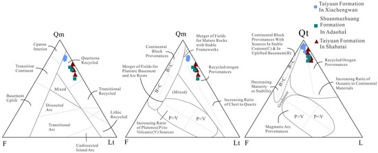 The samples of three sections all fall inside the quartz recycling range and the source area of the recycled orogenic belt, according to the Qm-F-Lt triangle figure (Figure 4). The clastic fractions of Shabatai and Adaohai are close to one another, and the drop points also are; while the drop points of the sandstone samples from Xiahengwan are closer to the inner region of the craton, and the drop points overlap, indicating that the material source is single and stable, and the percentage of single-crystal quartz in the clastic fractions is higher than that in the sandstones of the other two profiles. All three samples are located in the recycled orogenic belt provenance area, which is characterized by continental interior provenance, according to the Qt-F-L diagram. The Taiyuan Formation’s falling point in Xiachengwan is close to a stable craton and uplift basement area, but this is not proof that the provenance area has a stable craton and uplift basement background. It could be the result of the provenance area’s complicated lithology and transportation process. The analytical results of the triangle diagram suggest that the provenance input originates from the intracontinental orogenic belt. Quartz, predominantly single crystal quartz, makes up the majority of the detrital components in the three samples, according to statistics of the detrital results (Table 1). The absence of polycrystalline quartz of the Taiyuan Formation in Xiachengwan is compatible with the recycled orogenic belt’s character in the source region. It also shows how active the tectonic cycle and orogenic activity are in Xiachengwan.