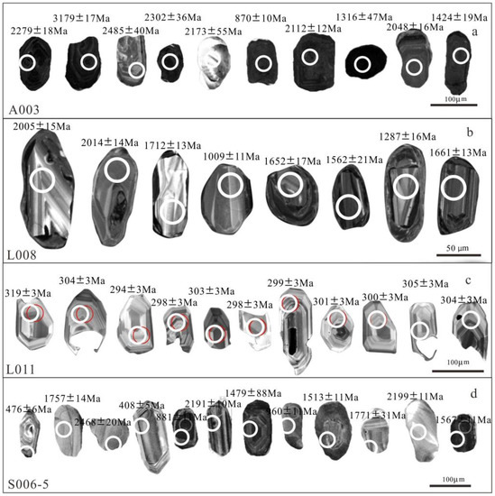 Cathodoluminescence images of representative zircon grains from the samples of A003 (a), L008 (b), L011 (c), S006-5 (d). In each frame, the top number is the U–Pb age.