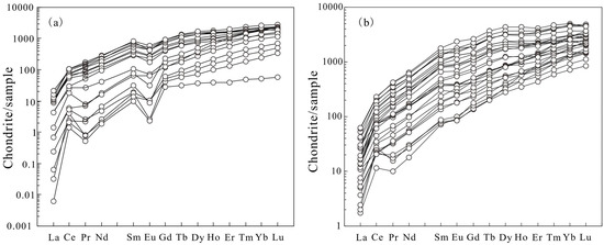 Chondrite-normalized rare earth element (REE) patterns for detrital zircons from the Taiyuan Formation in the Ordos Basin. (a) Lean to the left Ce positive abnormal Eu negative anomaly, (b) Lean to the left Ce negative anomaly.