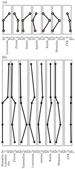 Variation trend of heavy mineral content and ZTR of the Taiyuan Formation in Shabatai (a) and Adaohai (b).