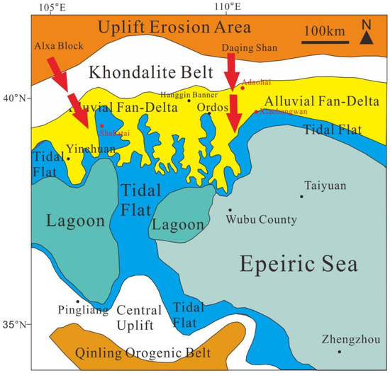 The provenance analysis of the Taiyuan Formation in the northern margin of the Ordos Basin reveals that the provenance area of the Taiyuan Formation in the eastern part is the Daqing Shan in the middle of the northern margin of the North China Craton, and the provenance area of the western part is the Alxa block. It is inferred that during the deposition of the Taiyuan Formation, due to the ancient Asian Ocean gradually closing, the Alxa block and Yinshan orogenic belt in the northern margin uplift belt of North China were uplifted cyclically many times, forming the northern source supply (Figure 11b), and the area north of the Yimeng uplift became the main source area [47,48]. The east–west differentiation of the provenance area is likely because a north–south central paleo-uplift of the Ordos Basin in the late Carboniferous–Early Permian Taiyuan period still exists, making the Taiyuan Formation accept the provenance of different provenance areas.