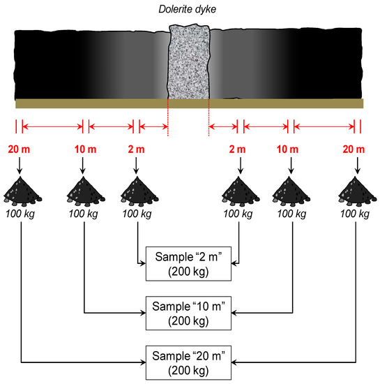 The samples used in the study were collected from three different distances (2 m, 10 m, and 20 m) from the geological contact with a dolerite dyke, the most common magmatic intrusion occurring in the mine. The sampling scheme is depicted in Figure 2. About 100 kg of material was collected from each set distance and on both sides of the dyke. As samples were obtained in ROM grain size and without depth specification, we decided to homogenize the samples extracted from equal distances before shipping them to the laboratory for testing, thus totaling 200 kg of raw sample for each set distance from the dyke.