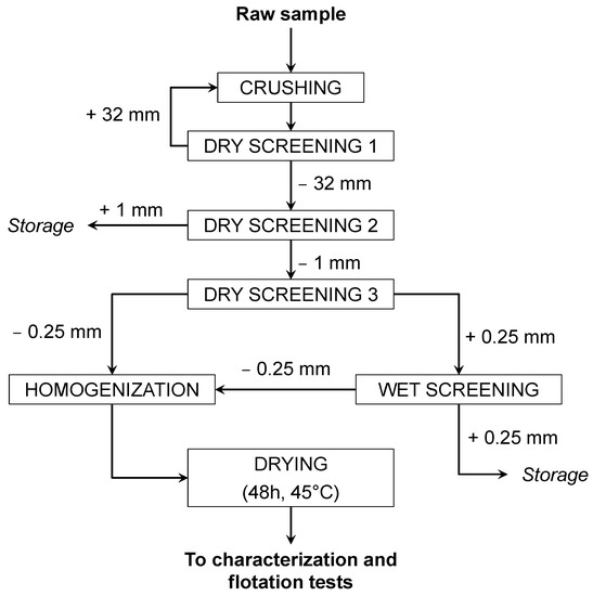The experimental work was divided into two main steps: (1) sample preparation and characterization and (2) flotation essays. The following section details the procedures carried out in each step.