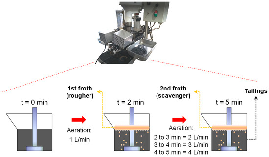 Bench flotation experiments were carried out using a CDC flotation cell with an impeller speed of 1000 RPM. The run time was set at 5 min and divided into two stages: (a) the first 2 min of operation corresponded to the “rougher” step; (b) the last 3 min corresponded to the “scavenger” step (running with the non-froth fraction from the rougher) (Figure 4). This scheme was used with the purpose to reproduce the rougher–scavenger operation mode of the flotation circuit in the Moatize mine (Figure 1) and to avoid losses due to excessive material handling. Additionally, to replicate the plant operation, the rougher stage was set to receive 80% of the total reagents (collectors and frothers) at the aeration rate of 1 L/min, whereas the scavenger stage received the other 20% of reagents at an increasing aeration rate from 2 L/min to 4 L/min (+ 1 L/min increment). Figure 4 details this procedure.