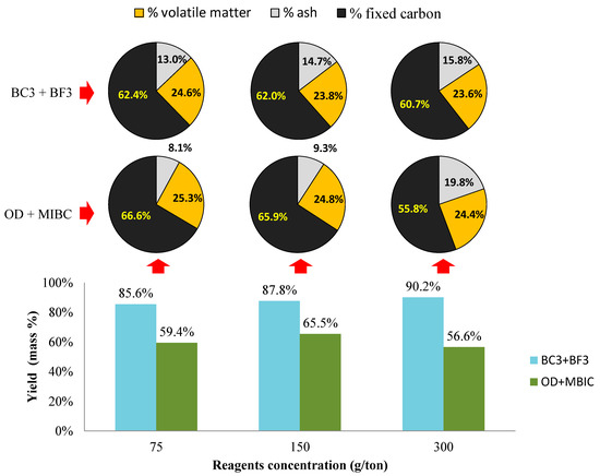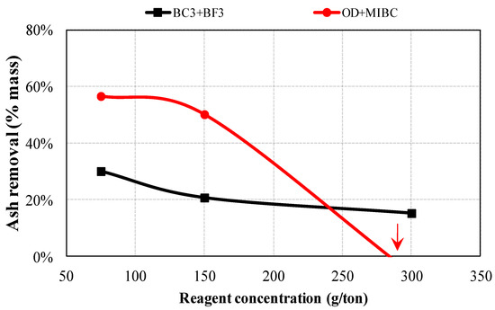 The ash removal indexes resulting from each test are shown in Figure 7. As can be seen, a higher reagent concentration deteriorated the separation performance, which was reduced to a great extent for 300 g/ton. Ash removal for the OD + MIBC system was a negative value (−6.0%) for this dosage, indicating that the concentrate was even richer in ash than the feed. This tendency is in agreement with the recent work of Huang et al. [14], who found that higher frother concentrations (in this case, BF3 and MIBC) harm performance in terms of both froth recovery and separation efficiency. On the other hand, for the lower concentrations, the OD + MIBC system led to significantly higher ash removals, resulting in cleaner products with ash contents below 10%.