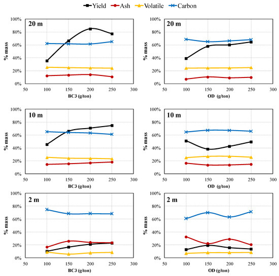 Figure 8 summarizes the results showing the yield, ash, volatile matter, and fixed carbon (% mass) of the obtained concentrates as a function of the dyke’s distance, reagent system, and collector dosage. In general, the yield was the most sensitive parameter, noticeably varying over different conditions. The average yields for the 20, 10, and 2 m samples were 60.8% (±16.9%), 54.8% (±13.8%), and 16.4% (±4.2%), respectively, demonstrating that, as a rule, the closer to the dyke the sample was, the lower the obtained yield was. The BC3 + BF3 system also displayed higher yields than the OD + MIBC one, with the average values (considering all distances) of 49.3% (±27.0%) and 38.7% (±19.0%), respectively. The relations between yield and collector dosages were less manifest, but some general trends could also be observed. With the exception of 10 m, OD + MIBC, relatively higher yields were obtained when using collector dosages above 100 g/ton, with peaks occurring in the range 150–250 g/ton depending on the distance and reagent system.