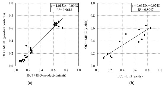 Correlation curves for product content (a) and yield (b) values considering the two reagent systems tested.