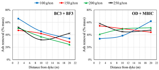 However, merely comparing the product’s yield and composition is not sufficient to evaluate the separation as a whole, as it also depends on the composition of the coal feed to the flotation system. In this regard, the proposed ash removal index (Equation (1)) can be useful, since reducing the ash content of coking and thermal coal underlies coal beneficiation processes. Figure 10 shows the evolution of ash removal indexes for the different conditions tested. The OD + MIBC system exhibited slightly higher selectivity, with an overall average ash removal of 48.0% (±8.0%) compared to 41.8% (±11.6%) in the BC3 + BF3 system. For low and intermediary reagent dosages (100 to 200 g/ton), opposite trends could be observed concerning the distance from the dyke: while the BC3 + BF3 system showed higher removals when approaching the dyke, the OD + MIBC system displayed better cleaning at larger distances.