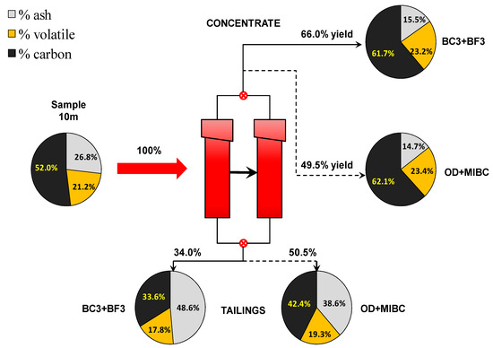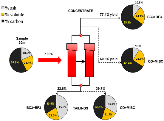 Figure 11 and Figure 12 illustrate the mass balances referring to the better separation scenarios experimentally obtained for each reagent system. Within the framework of this study, the best dosages were considered as those with generated concentrates that showed the lowest ash contents with yields of about 50% or more. As can be seen, the BC3 + BF3 system generated yields considerably higher than the OD + MIBC system (+17% in mass), although the last produced concentrates had slightly lower ash contents. In this sense, using the OD + MIBC system to process coal 20 m away from the dyke allowed us to obtain the lowest ash content of all concentrates (=9.1%), which was relatively close to the average content currently obtained in the Moatize plant (=7.5%).