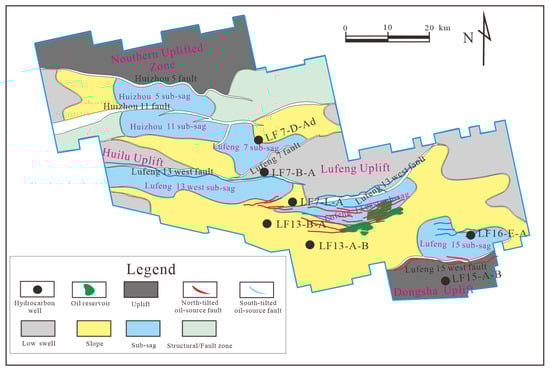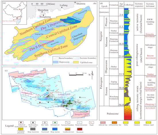 The Zhu I depression is located in the northern depression belt of the Pearl River Mouth Basin, spanning an area of about 37,380 km2 in the northeast–southwest direction. From north to south, it has five secondary sags: the Hanjiang, Lufeng, Huizhou, Xijiang, and Enping sags (Figure 1b). The Lufeng sag is located in the north of the Zhu I depression, adjacent to the Haifeng uplift in the north and the Huilu low uplift in the south, and is bounded by the northern uplift belt and Dongsha uplift in the east and west, respectively. It spans an area of about 7760 km2 and is the most explored hydrocarbon sag in the Zhu I depression []. Here, Paleogene strata are the key areas for further petroleum exploration [].