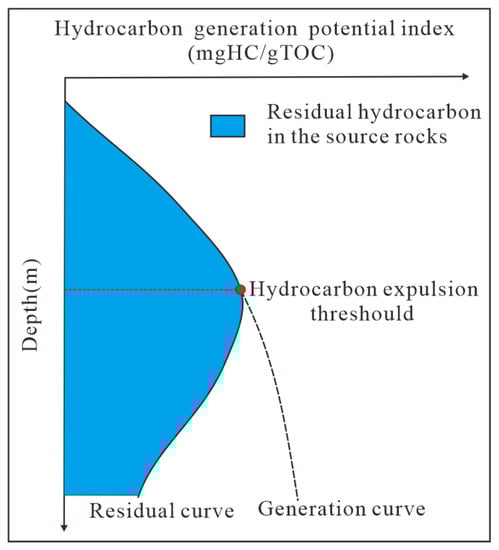 The HGP index was defined as (S1 + S2)/TOC) × 100 (mg HC/g TOC) and used to measure the number of hydrocarbons that can be generated per unit of organic carbon []. In the process of burial and thermal evolution of hydrocarbon source rocks, the HGP index shows a trend of increasing first and then decreasing. When the source rock begins to generate hydrocarbons, the hydrocarbons in the source rock are in an undersaturated condition, and all the generated hydrocarbons remain in the source rock. When the hydrocarbons generated by organic matter in the source rocks satisfy self-absorption and capillary saturation, they are discharged from the source rock in a free phase [,]. Pang et al. (2004) [] defined the geological condition in which hydrocarbons begin to be expelled as the free phase at the HET. The envelope curve of the HGP index data point reaches the maximum at the HET. Therefore, only when the burial depth of the source rock exceeds the HET does the source rock expel hydrocarbons (Figure 2) [].