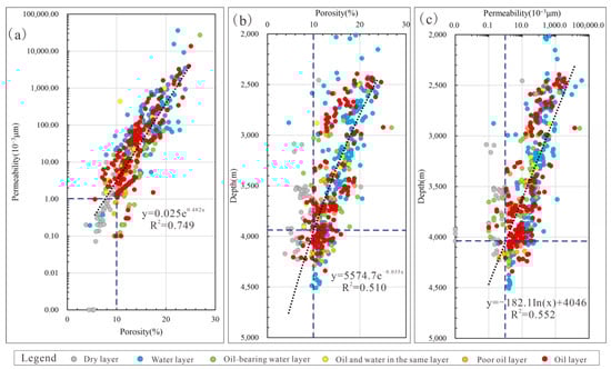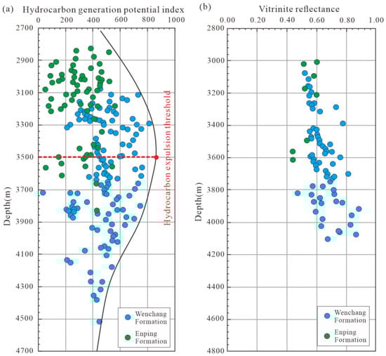 In 1997, Pang et al. [] proposed the theory of “hydrocarbon expulsion threshold (HET)” defined as follows: geological conditions such as the critical buried depth and vitrinite reflectance for hydrocarbons generated from source rocks to begin expelling hydrocarbons to the outside world in a free state after satisfying their self-retention in various forms. This theory has been accepted by most scholars, and the source rocks above the HET have almost no contribution to actual hydrocarbon generation. However, when they evolved below the HET, many hydrocarbon expulsion events occur and can be considered effective source rocks. Therefore, the HGP index was calculated based on the pyrolysis data and TOC data of 210 hydrocarbon source rock samples (Table A1). And, the relationship of HGP index variation with burial depth is established (Figure 3a). Then, the HET is judged according to the variation of the envelope of the HGP index data points in the longitudinal direction.