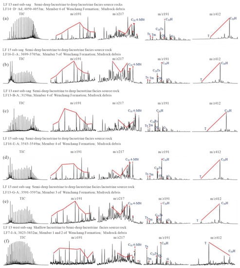 Characteristics of the biomarker in the typical source rocks of the WC in the southern Lufeng sag; (a) hydrocarbon source rocks of the WC6; (b) hydrocarbon source rocks of the WC5; (c) hydrocarbon source rocks of the WC4; (d) hydrocarbon source rocks of the WC3; (e) hydrocarbon source rocks of the WC2; (f) hydrocarbon source rocks of the WC1 and WC2.4.2; Crude Oil Source.