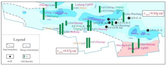 When hydrocarbons migrate along the transport layer, the viscosity and density of crude oil gradually decrease with increasing hydrocarbon migration distance. When hydrocarbons migrate along the open fault, the viscosity and density of crude oil increase because of oxidation []. The injection direction of hydrocarbons can be macroscopically judged using the physical properties of crude oil [,,]. Considering that the density data of crude oil from the WC is less and the regularity is not obvious enough, the density data of the other layers were used for the overall analysis. Fifteen crude oil samples were obtained from 15 wells in the southern Lufeng sag, with a uniform distribution of sample points. The density of the samples was statistically analyzed, and the results showed that the density of the crude oil widely varied, with an average of 0.86 g/cm3 and a range of 0.73–0.97 g/cm3. The main distribution range of 80% of the samples is 0.80–0.92 g/cm3. The crude oil is mainly light–medium oil, followed by condensate and heavy oil.