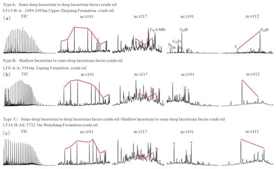 Characteristics of the biomarker of the three types of crude oil in the southern Lufeng region: (a) type A semi-deep lacustrine to deep lacustrine facies crude oil; (b) type B shallow lacustrine to semi-deep lacustrine facies crude oil; (c) type C mixed crude oil.