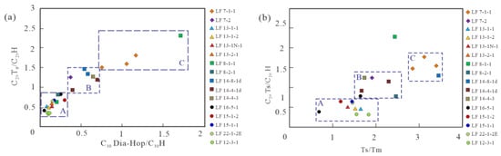 Comparison of parameters of biomarkers of crude oil in the southern Lufeng region: (a) relationship between C29 Ts/C29 H and C30 Dia-Hop/C30 H; (b) relationship between C29 Ts/C29 H and Ts/Tm.