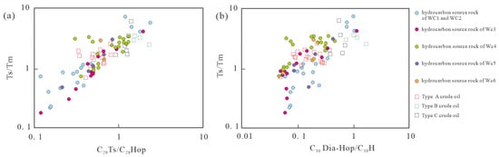 In this section, the oil and source rock are compared using the classification results of the crude oil types, combined with the organic geochemical analysis and test data of the source rocks. The degree of drilling in the Lufeng 13 west sub-sag, the Lufeng 13 east sub-sag, and the Lufeng 15 sub-sag is relatively high, and there is no obvious difference in the biomarker characteristics of the source rocks in each layer of the WC controlled by the same sedimentary facies in each sag. Therefore, the Lufeng 13 and Lufeng 15 sub-sags can be used as a whole for oil and source rock comparison. First, the crude oil source is determined by directly comparing the biomarker fingerprint of the crude oil and source rocks [], and C29Ts/C29H, Ts/Tm, and C30 Dia-Hop/C30H are selected as the parameters for the oil and source rock correlation (Figure 8). The comparison results show the following.