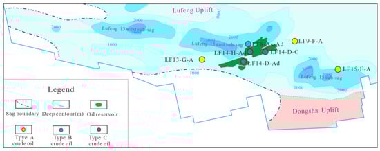 There are six sub-sags and two uplifts in the Paleogene of the Lufeng sag (Figure 1c). Of these, the Lufeng 13 and Lufeng 15 sub-sags are important hydrocarbon generation sub-sags and significant petroleum exploration blocks []. Up to November 2020, about 51 exploration wells had been explored in the Lufeng sag, only 4 of which are Paleogene industrial hydrocarbon wells. The distribution of Paleogene hydrocarbon reservoirs has been very limited, mainly distributed in the southeast of the Lufeng 13 eastern sub-sag. In addition, a Paleogene reservoir has also been drilled in the area where the Lufeng 7 sub-sag and Lufeng 13 sub-sag intersect. However, this reservoir area is small, and no significant hydrocarbon discoveries have been made in the exploration wells deployed around the reservoir (Figure 1c).