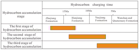 The results revealed that the time of the hydrocarbon accumulation in the WC is relatively late. During the sedimentary period of the upper Zhujiang Formation (18.1 Ma), the hydrocarbon began to accumulate in the traps, which has continued to the present day. The hydrocarbon accumulation phase can be classified into three stages according to the concentration degree of the hydrocarbon accumulation time (Figure 10).