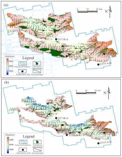 Plane distribution characteristics of structural ridges in Lufeng sag: (a) the upper WC; (b) the lower WC.