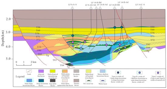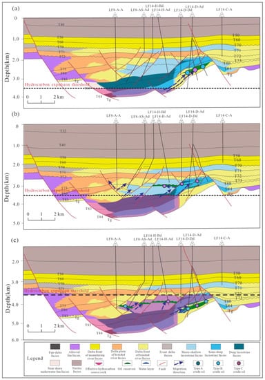 Type C crude oil belongs to the mixed-source oil generated by source rocks of the WC4 and the WC3 and part of upper WC source rocks. Therefore, the biomarker parameters such as C29Ts/C29Hop, Ts/Tm, C30Dia-Hop/C30H, and T/C30H values of this type of crude oil are among the parameters of Type A and Type B crude oil. This mixed-source oil is mainly found in the LF7-2 reservoir in the Lufeng 13 west sub-sag and the Wenchang Formation reservoirs in the LF14-4 and LF14-8 reservoirs in the Lufeng 13 east sub-sag. Generally, the crude oil from source rocks of the upper WC is mainly contaminated and filled with crude oil from source rocks of the WC4 and the WC3 (Figure 9).