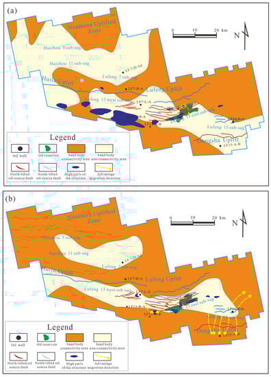 Fault migration systems are important vertical migration channels of hydrocarbons. The development scale, characteristics, and sealing of faults are the key factors affecting fault migration systems [,,,]. According to the contact relationship between the fault and the effective source rock, the faults are classified into oil–source faults and non-oil–source faults. When a fault cuts through the effective source rocks, it is an oil–source fault; otherwise, it is a non-oil–source fault. The effective source rocks include the WC source rocks in the Lufeng 13, Lufeng 15, and Lufeng 7 sub-sags with burial depths exceeding the HET. Thus, the oil–source faults are considered to have vertical communication with the hydrocarbon sources (Figure 11). A total of 30 oil–source faults are identified. Of these, six oil–source faults are in the Lufeng 15 sub-sag, and non-oil–source faults are developed inside the sag. There are 19 oil–source faults in the Lufeng 13 east sub-sag and 12 oil–source faults inside the sag, and the density of oil–source faults inside the sag is large. Paleogene hydrocarbon is mainly distributed in the Lufeng 13 east sub-sag oil–source fault distribution zone. There are five oil–source faults in the Lufeng 13 west sub-sag and no oil–source faults inside the sag (Figure 12).
