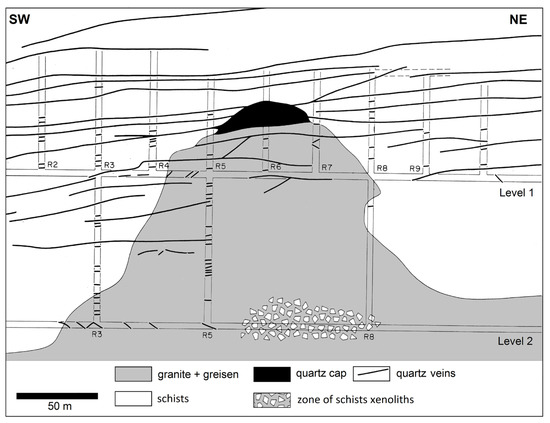| 10 | Mine, level 1, western contact of the cupola | Quartz-rich greisen with sulfides |