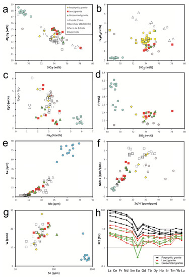 4.2. Bulk-Rock Chemical Composition of Granites and Greisens