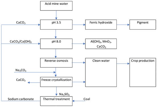 Mining processes produce huge volumes of solid and liquid waste that must be properly managed to reduce environmental risk. Mine tailings, the by-product of mineral processing, are typically dumped as slurry in sizable impoundments or storage facilities [1,2,3]. Acid Mine Drainage (AMD) is difficult and expensive to treat because it contains many hazardous metals. If AMD is not adequately managed it causes significant environmental degradation, water contamination, aquatic ecosystem, and has a severe health impact on nearby communities [1,4,5]. According to South African legislation, mine water must be treated to a level suitable for drinking water, and ideally there should be zero-waste [6]. The physical and chemical stability of the acid mine waste and reservoirs is the primary issue with regard to the management of AMD [5,7]. Furthermore, the next problem is the storage of sludge before it is collected, and the sludge must be treated to easily regulate and stabilize pollutants in it; however, this process is costly. Before treatment plants can be built, Environmental Impact Assessment (EIA) studies are required if waste is produced. By stopping the production of any waste such lengthy investigations and approval procedures can be avoided. Therefore, operations must be able to produce products that can be sold, rather than mixed sludge that must be dumped on the ground or brines in evaporation ponds. For instance, it has been reported that AMD sludge can be recycled to create adsorbents that can remove pollutants from wastewater such as rare earth elements and heavy metals [7].
