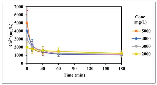 The oversaturated gypsum solution was prepared by mixing CaCl2 and Na2SO4 solutions in the presence of an inhibitor. Fe(OH)3 sludge was produced by adding an FeCl3 solution and NaOH to adjust the pH to 3.5. It was realized that this condition differs from the situation that will be applied in practice. In the real situation, a CaCO3 (limestone) slurry will be dosed to an Fe2(SO4)3 solution to raise the pH to 3.5. This differs in the sense that the inhibitor needs to inhibit gypsum crystallization, not only in the absence of any solids, or in the presence of only Fe(OH)3, but in the presence of both Fe(OH)3 and CaCO3 solids. Figure 10 shows that when Ca2+ came from a solution of CaSO4, it remained completely in solution for 30 min. In the case where Ca2+ came from CaCO3(s), gypsum crystallization took place at a slow rate during the first 30 min. It was concluded that higher inhibitor doses may be needed when CaCO3 is used for gypsum inhibition to allow selective recovery of pigment. Figure 10, Figure 11 and Figure 12 show that gypsum crystallization could still be suppressed when CaCO3 is dosed, but that higher inhibitor concentrations were needed.