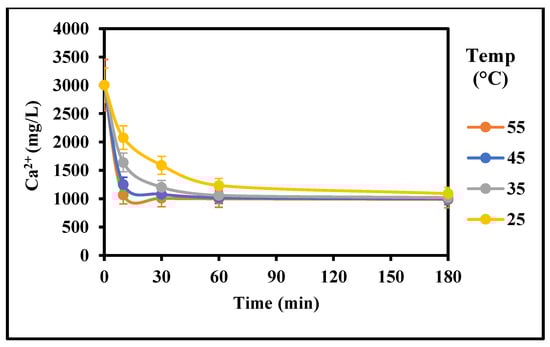 Effect of temperature on the rate of gypsum crystallization (3000 mg/L CaSO4 (as Ca), 5 g/L gypsum seed, 0 g/L Fe3+, 0 mg/L Inh, 25–55 °C, stirring rate: 200 rpm; Stirring time (min): 180/180).