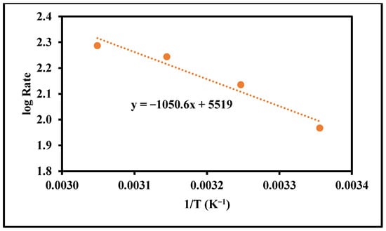 The effects of temperature on the formation of gypsum crystals were also investigated. Figure 4 shows the effect of temperature on the reaction rate, the higher the temperature, the faster the rate of crystallization. The Arrhenius equation log k = log A − E/(2.303RT) was used to estimate the value of the reaction rate k at other temperatures. The amounts E, R, and log A have the values 4.80 kcal/mole (activation energy), 1.987 (a constant) and 5.52 cal mole−1 degree−1 (gas constant), respectively (Figure 5).