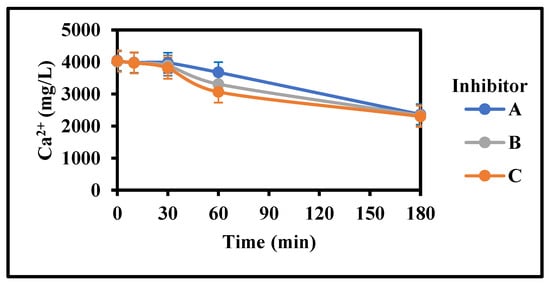 Figure 6 compares three commercially available inhibitors that were identified by Mogashane as the most promising [28]. A dosage of 100 mg/L inhibitor A kept 4000 mg/L CaSO4 (as Ca) in solution for a period of 30 min in the presence of 4 g/L Fe3+ at pH 3.5 when stirred at a rate of 200 rpm for the total period. All three inhibitors were poli acrylate. The results reported by Rabizadeh (2016) [18] demonstrated the effects of 20 ppm poly(aspartic acid) (PASP) and poly(acrylic acid) (PAA) compounds on the crystallization of gypsum. The comparison showed that PAA worked better than the other anti-scalants, and it inhibited the formation of gypsum [18].