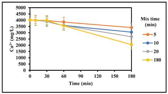 Effect of mixing time on the rate of gypsum crystallization with initial mixing (4000 mg/L CaSO4 (as Ca), 0 g/L gypsum seed, 4 g/L Fe3+, 0–100 mg/L Inh. A, 25 °C, stirring rate: 200 rpm; Stirring time (min): 5 to 180/180).