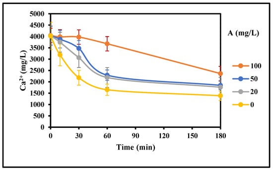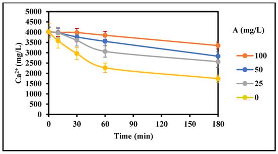 Effect of inhibitor A concentration on the rate of gypsum crystallization with initial mixing (4000 mg/L CaSO4 (as Ca), 0 g/L gypsum seed, 4 g/L Fe3+, 0–100 mg/L Inh. A, 25 °C, stirring rate: 200 rpm; Stirring time (min): 5/180).