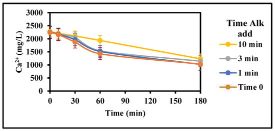 Effect of CaCO3 addition period on gypsum inhibition (Top Dam water, 15 g/L Acidity, 4 g/L Fe3+, 22 g/L CaCO3, 0 g/L gypsum seed, 100 mg/L Inh. A, 25 °C, stirring rate: 200 rpm; Stirring time (min): 180/180; CaCO3 addition: Time 0 to 10 min).