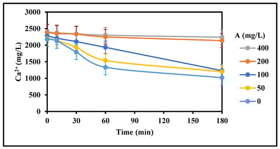 Effect of inhibitor concentration gypsum inhibition (Top Dam water, 15 g/L Acidity, 4 g/L Fe3+, 22 g/L CaCO3, 0 g/L gypsum seed, 100, 200, 400 mg/L Inh A, 25 °C, stirring rate: 200 rpm; Stirring time (min): 180/180; CaCO3 addition period: 10 min).