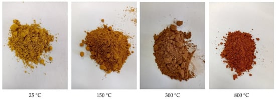 Fe(OH)3 produced during neutralization of mine water with CaCO3 can be changed to yellow pigment (Goethite) by heating to 150 °C, and to red pigment (Hematite) by heating to 800 °C (Figure 13). Mogashane et al. (2022) investigated the effect of temperature on the color when Fe(OH)3 produced during neutralization of AMD with Na2CO3 is heated. Their study showed that temperature has a dominant influence on the color [28]. Figure 13 shows the effect of temperature on the color when Fe(OH)3 is heated. It indicates that temperature has a dominant influence on the color. Figure 13 shows examples of goethite and hematite that were produced from acid mine-water.