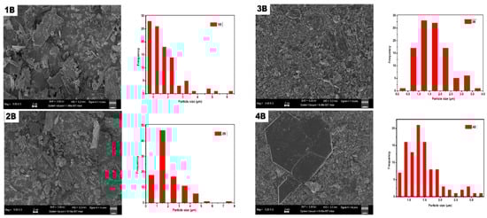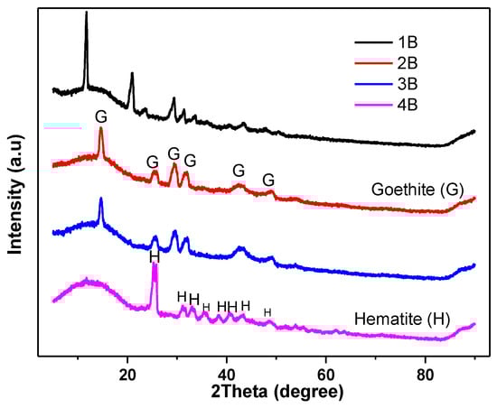 The average crystallite sizes of the samples (1B, 3B), Hematite (4B) and Goethite (2B) were calculated using the Debye–Scherrer formula (Equation (2)) [36]: