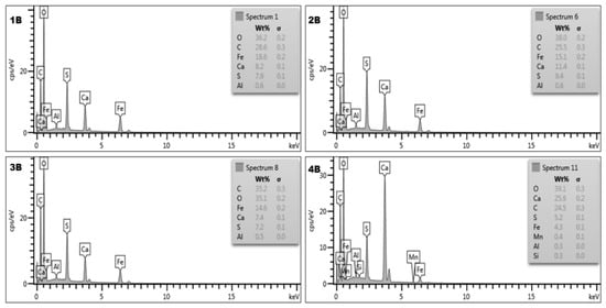 Figure 16 shows the mapping of the elemental composition of the samples (1B, 3B), Hematite (4B) and Goethite (2B). The synthesized pigments were found to be enriched with Fe and O as principal elements. Moreover, traces of other elements (Ca, C, Al, S, Si and Mn) were present. The results obtained show that the synthesized samples 1B, 2B, 3B and 4B consisted of 55.8%, 53.1%, 49.8% and 43.4%, respectively, of Fe-O mineral. This demonstrated that goethite and hematite nanoparticles were produced. However, significant levels of sulfate were found in all the samples; this was likely the result of oxyhydrosulfates that formed during the precipitation of Fe-O minerals. CaCO3 alkali was added to AMD when preparing these samples. The results attained confirmed that the synthesized pigments were rich in Fe-O constituents. The XRD results showed that the a-FeOOH was contaminated with Ca, coming from the CaCO3, S and Al3+, coming from the SO42− and Al3+ in the mine water. Further studies will be carried out to determine: (i) the value of the contaminated pigment; and (ii) if the pigment impurity can be improved through an acid wash.