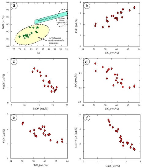 Figure 4. Mineral chemistry of the olivine gabbro: (a) variation of NiO (wt.%) and Fo contents of olivine in the olivine gabbro compared to the mantle olivine array [27], ANS layered intrusions [19,21,22]; and Arabian Shield ophiolites [13,23,24,25,26], (bf) loveringite composition: (b) TiO2 vs. CaO, (c) FeO* vs. MgO, (d) TiO2 vs. ZrO2, (e) TiO2 vs. V2O3, and (f) CaO vs. REE + Y2O3.