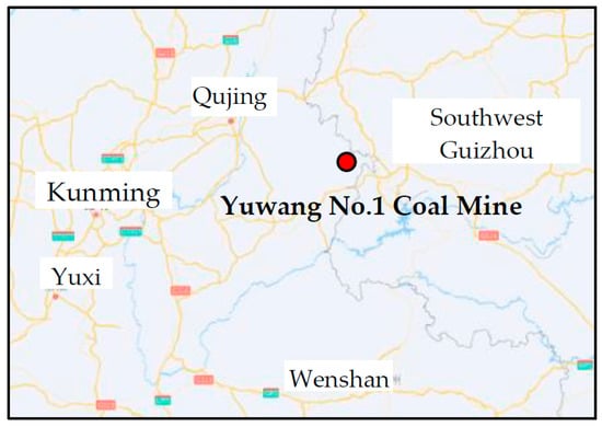 The Yuwang No.1 Coal Mine is a fuel-supporting project for the power plant of the Huaneng Yunnan Yuwang Coal and Power Integration Project, which is one of the “Four Hundred” key construction projects in the Yunnan Province and was started in March 2009. The mine is located in the Yuwang Township, Qujing City, Yunnan Province, approximately 100 km from Fuyuan County, 170 km from Qujing City, and 25 km from the Shankun Expressway (the traffic location is shown in Figure 1). The wellfield is approximately 4.2 km to 10.2 km long and 1.8 km to 7.1 km wide with a wellfield area of 31.75 km2, geological reserves of 653 million tonnes, industrial reserves of 520 million tonnes, design recoverable reserves of 336 million tonnes, a design production capacity of 3 million tonnes/a, and a service life of 79.9 years. The coal seams mined in the field are medium ash, low-to-high sulphur, high calorific value, low phosphorus, exceptionally low chlorine, and good thermal stability No. 3 anthracite coal. The coal-bearing strata in the mine are the Permian Longtan Group and the Changxing Group, with 11 recoverable and partially recoverable coal seams, with a total recoverable coal seam thickness of 32.28 m and mainly stable and relatively stable medium-thick coal seams with a thickness of 2–3 m, which are more suitable for mining. The coal seams are gently buried with a dip angle of 6–15° and moderate layer spacing, making for good resource conditions. Although the coal seams are not spontaneously combustible and have no risk of explosion, the gas content is high and the permeability is low, and there is a risk of coal and gas protrusion, so the technical conditions for mining are complex.